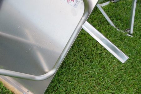 Materiál: Tenký ocelový plech, hliníkové nohy, dřevěné konce