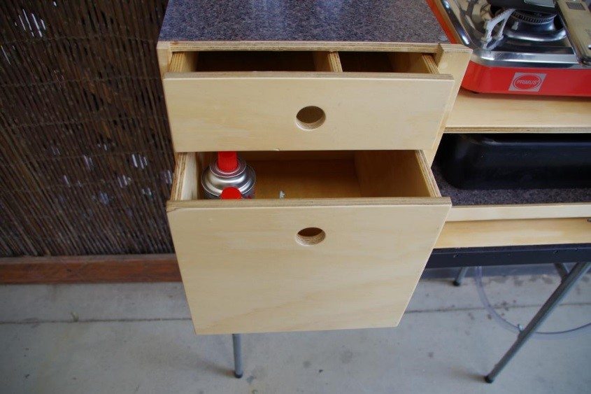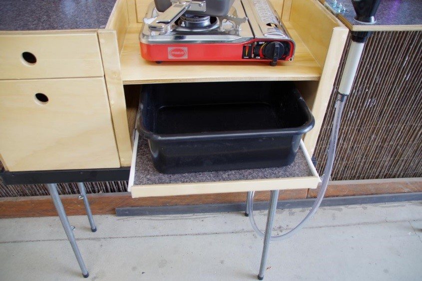 Kuchyně má dvě hluboké zásuvky se západkami. Spodní zásuvka je dostatečně vysoká pro uložení plynových kartuší. Dále obsahuje výsuvnou zásuvku s dřezem a plastovou mycí vanou.