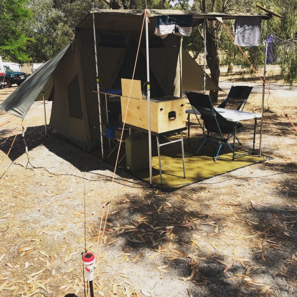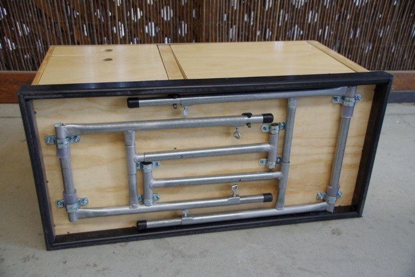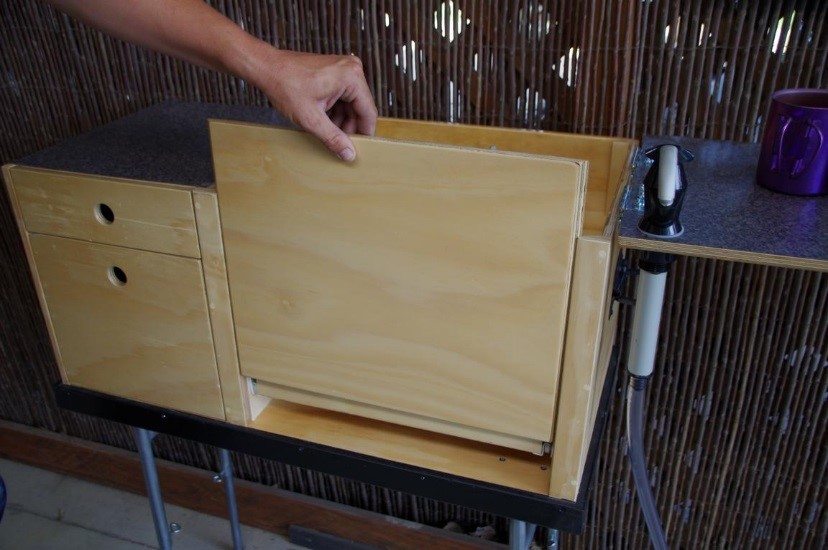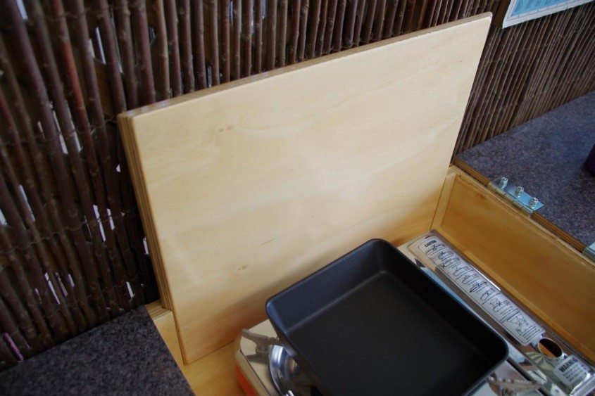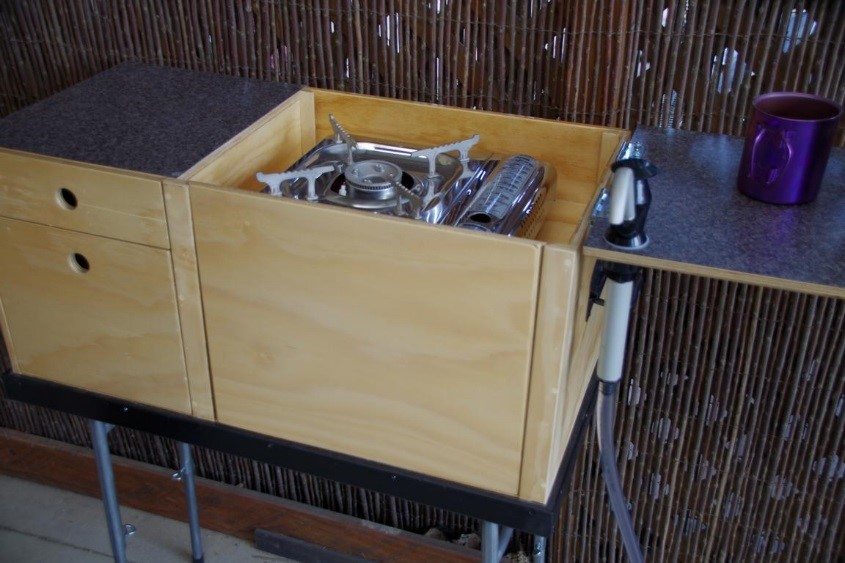 Dostatek prostoru pro jednoplotýnkový vařič. Přední panel kuchyně lze vyjmout a zasunout zezadu jako větrolam. Víko při otevření podpírá noha. Na obou stranách jsou madla pro přenášení a umístění kuchyně podle potřeby. Nohy se sklápějí pod tělo kuchyně pro transport a jsou výškově nastavitelné.